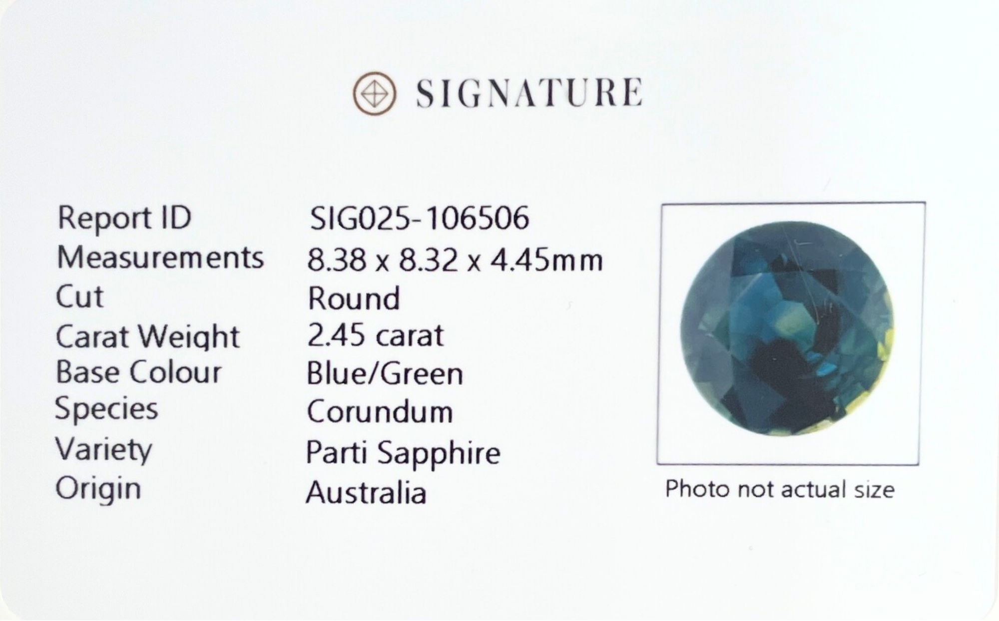 Encircling the parti sapphire is a sparkling halo comprised of twenty-four natural round brilliant cut (RBC) diamonds. This halo adds an additional layer of brilliance and sophistication to the centerpiece.