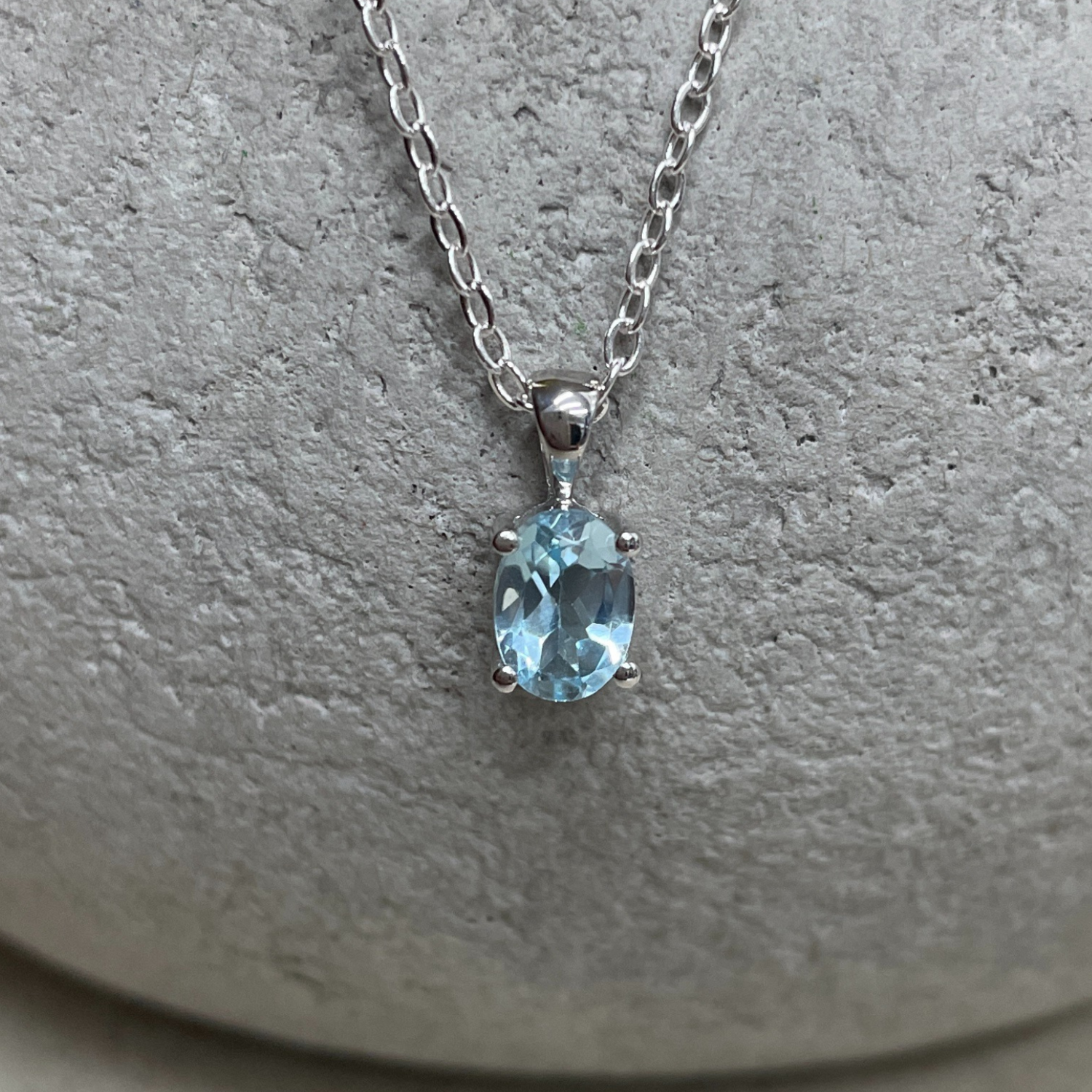 9ct White Gold Topaz features a beautiful, sparkling light blue Natural Topaz stone that measures 7x5mm. Set securely in a four claw setting with fixed bail. The total length of the pendant is 10mm.