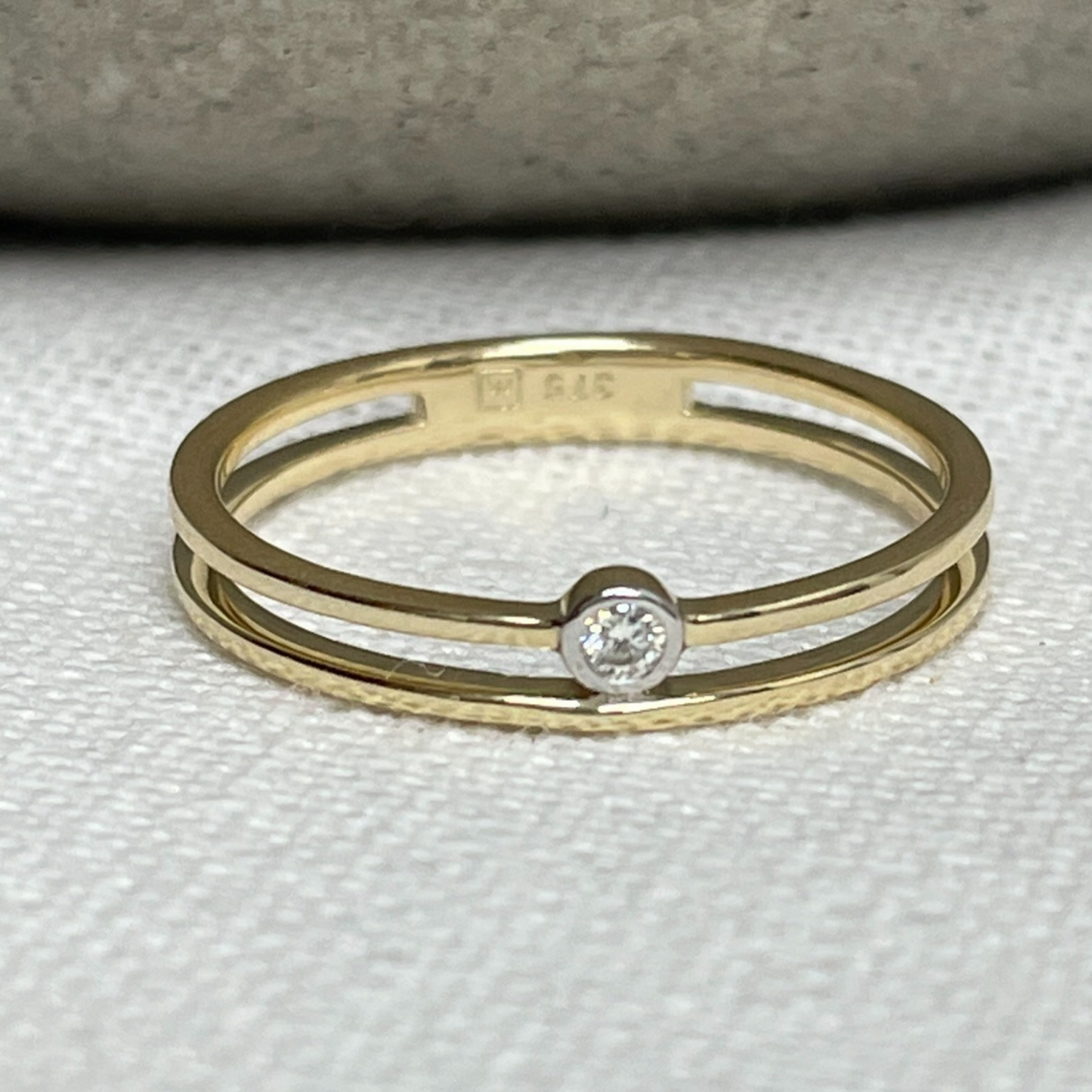 The ring features a rubover setting with one round brilliant cut diamond, which equals 0.03ct. The rubover setting helps to protect the diamond and keep it securely in place, while the split band adds a unique touch to the overall design.