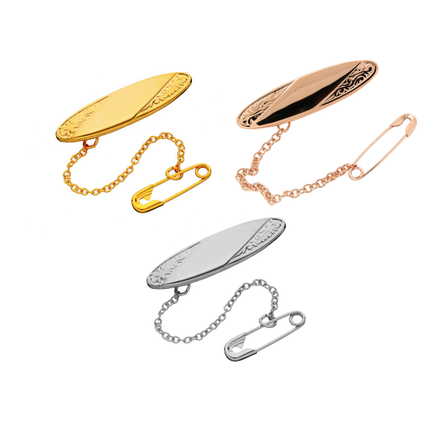 An oval shaped children's brooch with an elegant embossed design. Crafted with a non-precious safety chain.