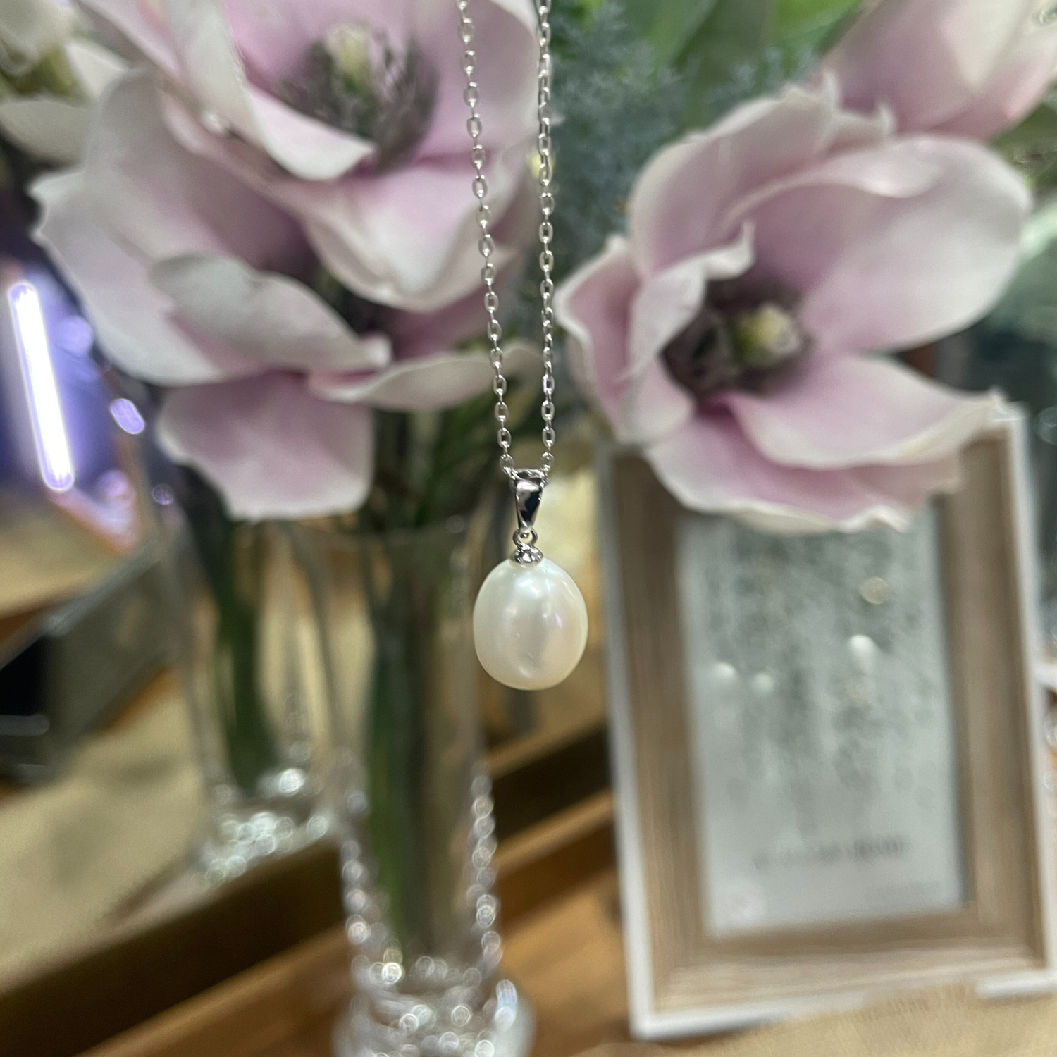 Sterling Silver 10mm White Keshi Pearl Pendant & Chain